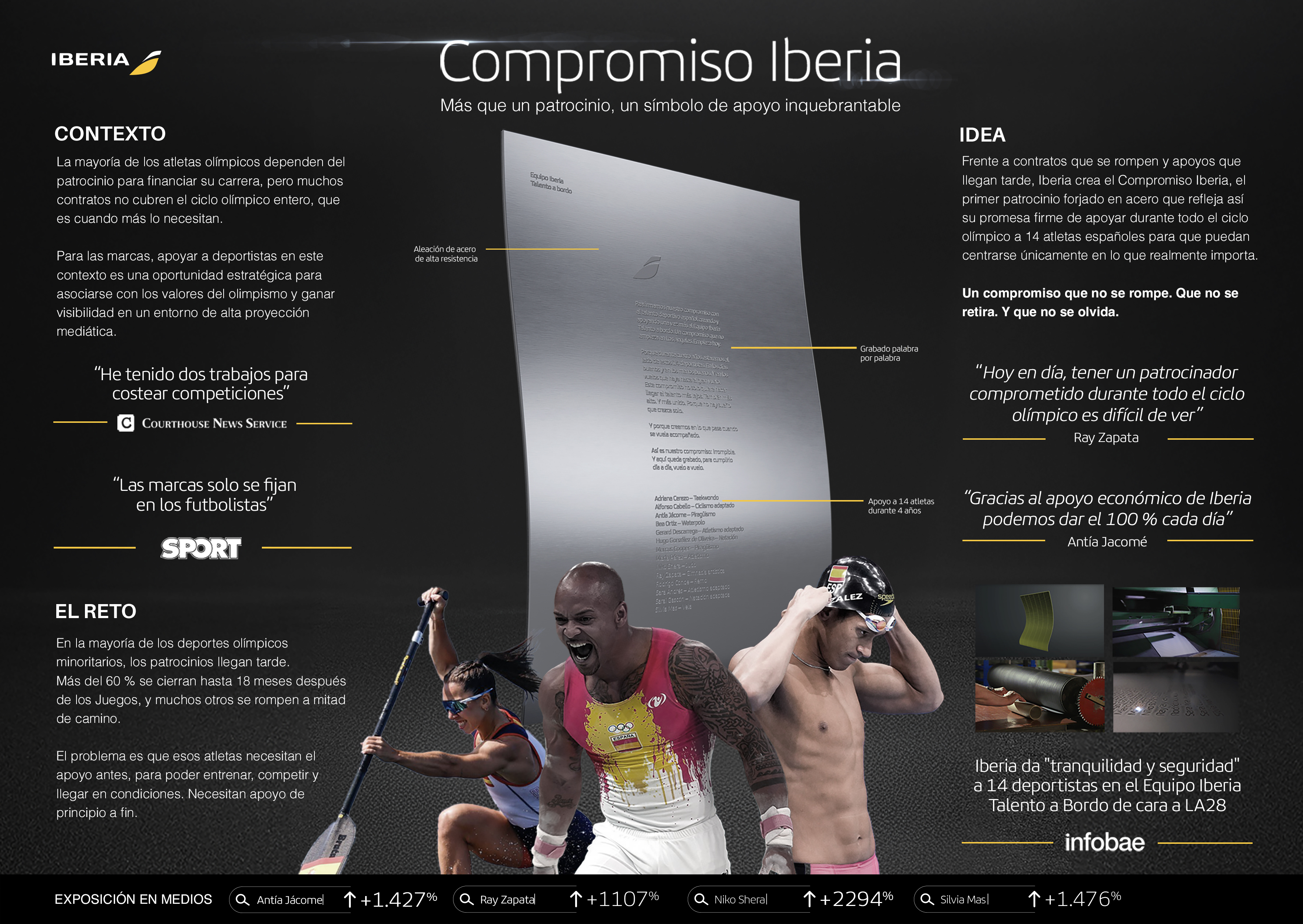 Iberia es una de las pocas marcas que acompañan a los deportistas durante todo su viaje a los Juegos Olímpicos. Sin excusas, sin peros y, sobre todo, sin retirarse antes de tiempo. Porque el apoyo al deporte no debería romperse tan fácil como un contrato en papel, Iberia visibiliza este gran problema creando su primer compromiso de un material que lo puede todo.